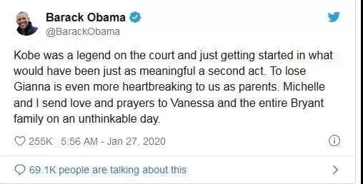 “科比是球场上的传奇,并且刚刚开启他第二段具有意义的人生。作为同样为人父母的人,听到吉安娜在事故中去世更让人心碎。米歇尔和我为瓦妮莎和整个科比的家庭送上最诚挚的祝福和祈祷,这是令人悲伤的一天。”