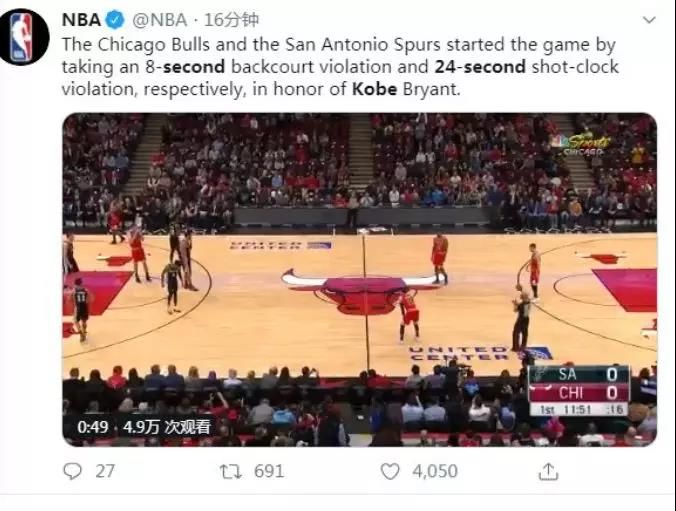 在昨天天NBA的8场比赛中,所有球队都在开赛前对科比进行纪念和默哀,其中,火箭与爵士的比赛开场后,爵士队和火箭队也分别以24秒违例和8秒违例来悼念科比。